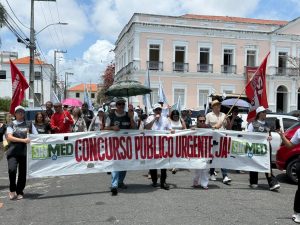 Na manhã desta terça-feira (30), médicos e demais trabalhadores da saúde realizaram uma manifestação conjunta no centro de Natal, em defesa de melhores condições de trabalho e valorização do serviço público. A mobilização teve início na sede do Sindicato dos Médicos do RN (Sinmed RN) e seguiu em caminhada pelas ruas da cidade, passando pela Secretaria Municipal de Administração e encerrando com um ato em frente à Prefeitura.